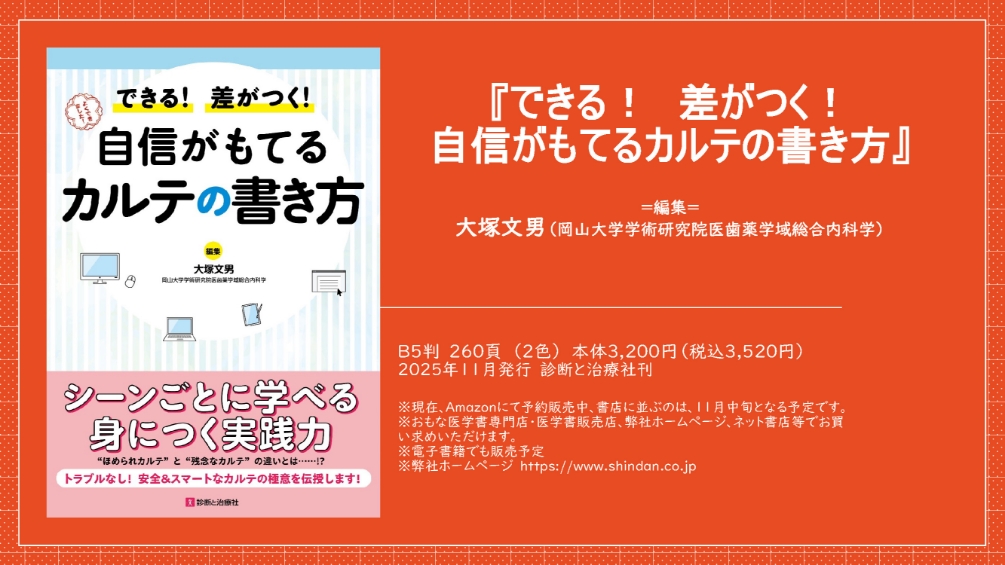 「できる!差がつく!自信がもてるカルテの書き方」大塚文男編集(診断と治療社)を発行しました。 鍋島茂樹,武岡宏明が、制作に携わっています。ぜひ、手に取ってみてください。