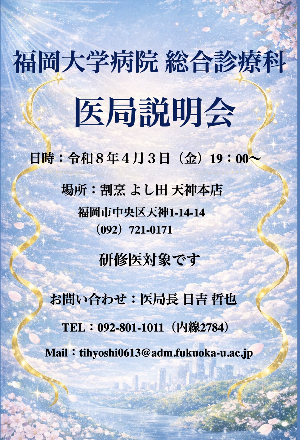 令和8年4月3日(金) 割烹 よし田 天神本店 にて医局説明会を開催します。興味がある方は、ご連絡をお願いします。お待ちしています。