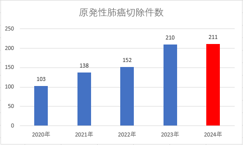 当科では肺癌診療にもっとも重点を置いています。2024年は九州地方の病院で肺癌手術症例がトップとなりました。 ほとんどの症例でロボット・ または胸腔鏡手術により胸の筋肉や肋骨を切らずに低侵襲手術(内視鏡手術)を行っています。 診断から治療まで、お急ぎの場合は初診から1~2週間で施行し、早期社会復帰を可能にしています(ホットライン080-8385-1195を随時ご利用ください)。 これまで切除が困難だった進行癌に対しても最新の手術用ロボットをもちいて低侵襲ロボット手術を行っています。 低侵襲手術が無理と言われた患者様にも高い技術をもって応えてきました。 低侵襲手術は術後の痛みや体の負担が少なく、90歳を超えるご高齢の方でも翌日から歩行が可能で早期退院していただいております。 縦隔腫瘍も九州で最も多い症例数をほとんど低侵襲手術で行っています。