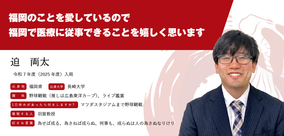 福岡県田川郡出身で、久留米大学附設高等学校、長崎大学、熊本での初期研修を経て福岡に帰って参りました。福岡のことを愛しているので福岡で医療に従事できることをうれしく思います。
